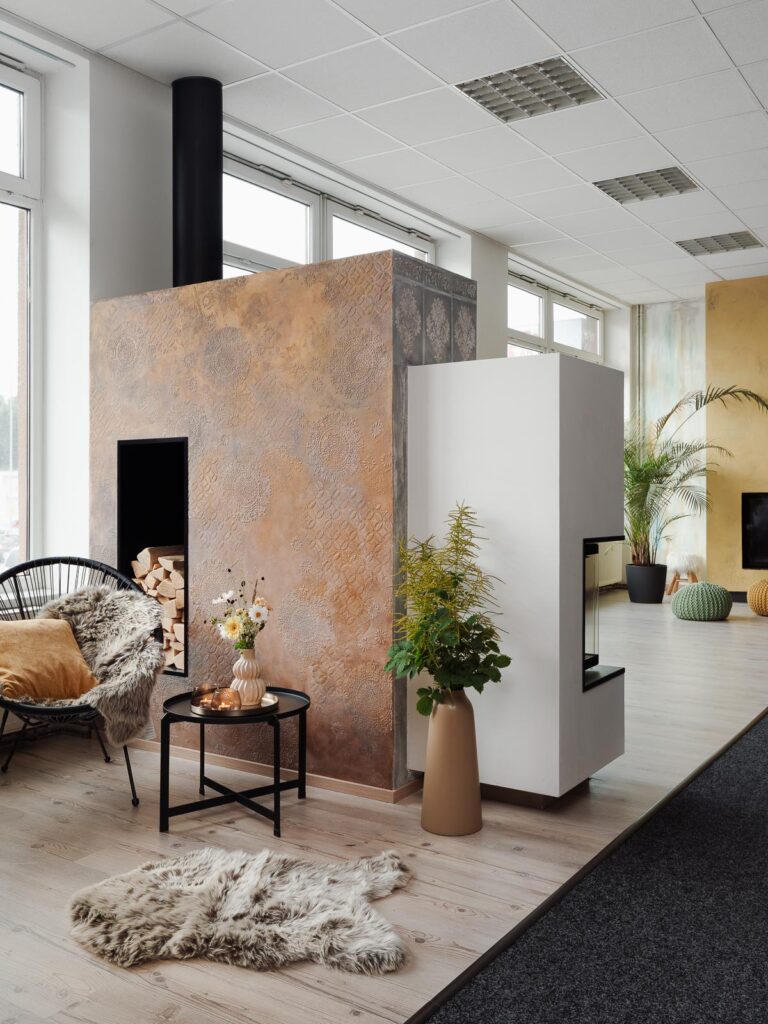Velkorysá krbová obestavba je doslova zlatým hřebem velkých a vzdušných prostor. Zlatý povrch dokresluje její naprostou výjimečnost a dojem z ní je jednoduše kouzelnický.
